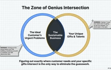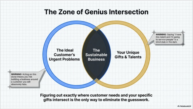 The source is clear: ignoring this intersection is a fatal strategic error. If you launch a service based on a talent but fail to map it against a specific, defined customer need, you are "stabbing in the dark." You may end up solving a problem for a customer you ultimately hate, or building a business that drains your energy because the alignment is missing. Alignment is the only way to ensure that your business provides maximum market value while remaining personally sustainable.